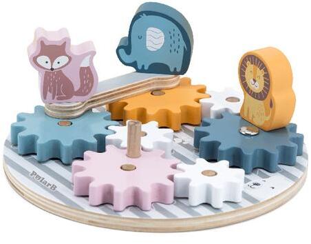 Fából készült színes erdei állatok fogaskerekeken. A játék a mindenki által ismert fogaskerekeken alapszik, melyekre felhelyezhetőek az aranyos állatok. Fejleszti a gyermekek finommotorikus készségét és szem-kéz koordinációját. Segít a problémamegoldó készség és az összefüggések felismerésének fejlődésében. Ezeken felül ismereteti és gyakoroltatja az állatok és színek elnevezéseit. Termékméret: 18 x 18 x 7,2 cm