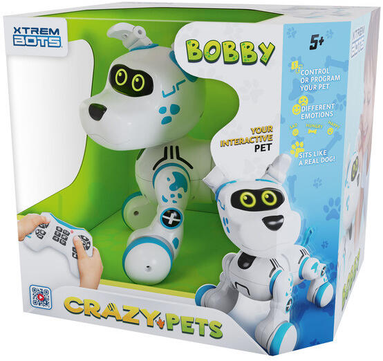Az Xtrem Bots Bobby robotkutya egy élénk funkciókkal rendelkező interaktív játék, amely nagyszerű ajándék 5 éves kortól. A kutya több mint 20 különböző hangot és ugatást tud kiköpni, LED fényekkel világít, valamint reagál érintésre is. Képes különböző mozgásokra: tud előre, hátra, jobbra és balra haladni, ülni és feküdni. Az irányítása távirányítóval történik, illetve előre programozható mozdulatokkal (akár 40 mozdulat), hogy változatos működést biztosítson. Az elemek (a robot működéséhez és a távirányítóhoz is) nem tartozékok, ezeket külön kell beszerezni. A termék műanyagból készült, lekerekített élekkel, gyerekbarát kialakítással. Mérete kb. 26 × 23 × 27,5 cm, súlya kb. 1,1 kg; ami biztosítja a stabilitást, de közepes hordozhatóságot.