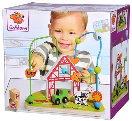Eichhorn golyóvezető fajáték - Farm A kézügyesség fejlesztésére kiválóan alkalmas fajáték, amivel nem csak a színek világába nyer bevezetést a gyermek, hanem a farmon élő állatokkal is megismerkedhet. A különböző alakú és hosszúságú drótokon csibe, hold és golyó alakú formákat kell végigvezetnie a gyerekeknek, amivel jól szórakoznak. A kis kezeknek nagy kihívást jelenthet a játék, így fejlődésük garantált. A játéklapon boci és kisautó is található a kisfiúk örömére. Mérete: 16 x 23 x 20 cm Fejlesztő játék, mely által fejlődik a kisgyerek finom-motoros készsége és a kreativitása. A játék érdekessége továbbá, hogy természetes anyagból készült, így megismerhető a fa tapintása és tulajdonságai. A gyártó nem mellesleg garantálja, hogy környezettudatosan nem erdők kivágásának köszönhetően készülnek el fa játékaik, hanem külön erre a célra ültetett fákból gyártják őket. Ajánlott: 2 éves kortólGyártó: Eichhorn