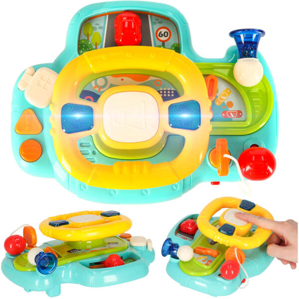 Az interaktív kormánykerék gyerekeknek egy olyan játék, amely aktív játékra ösztönöz, tele dallamokkal és valósághű hangokkal. A kormánykerék segítségével a gyerekek irányíthatják a piros autót a műszerfalon. Valósághű hangok, például a motor indítása, az irányjelzők vagy a kürt bekapcsolása, valamint hat dal és hat dallam fokozza a szórakozást. A világító irányjelzők még valósághűbbé teszik a játékot. A játék három AA elemmel működik (nem tartozék). A készletben található praktikus pánt lehetővé teszi a kormánykerék rögzítését a babakocsihoz, így a gyerek is jól szórakozhat a séták során. A játék támogatja a kismotorika fejlesztését, serkenti a hallást és a látást. Műszaki adatok: Anyaga: műanyag Szín: kék Kor: 18m+ Hatások: hang és fény Hangerőszabályzó: igen Tápellátás: 3x AA elem (nem tartozék) A játék méretei: 23 cm x 17,5 cm x 10 cm