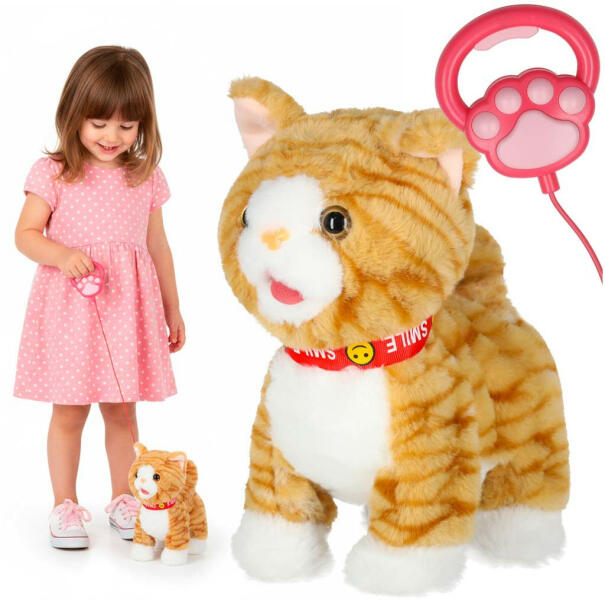 Interaktív plüss macska pórázon - Sétál, nyávog és csóválja a farkát! ? Ez a bájos, bézs színű interaktív plüss macska tökéletes barát minden gyermek számára! A macska sétál, nyávog, csóválja a farkát, és még dalokat is énekel, így órákon át szórakoztatja a kicsiket. A póráz segítségével a gyerekek sétáltathatják a cicát, mintha egy igazi háziállatuk lenne. Főbb jellemzők: ? Sétál és nyávog: A macska a pórázon lévő gomb megnyomásával sétál, miközben édesen nyávog. ? Dalokat játszik: Angol nyelvű dalokat énekel a még nagyobb szórakozás érdekében. ? Reagál az érintésre: Ha megsimogatod a fejét, nyávog, mozgatja a fejét és a nyelvét. ? Puha plüss anyag: Kellemes tapintású, így a gyerekek szívesen bújják hozzá. ? Ideális ajándék: Színes dobozban érkezik, így tökéletes meglepetés bármilyen alkalomra. Műszaki adatok:Jellemző ÉrtékÉletkor 3+Szín Bézs, szürke, fehér, rózsaszín pórázAnyag Plüss, műanyag, elektronikus elemekEnergiaellátás 3x AA elem (nem tartozék)Póráz hossza 70 cmFunkciók Járás, fejmozgás, nyelvmozgás, farokmozgás, nyávogás, dalokMacska súlya 0,45 kgCsomag súlya 0,5 kgMéretek: Magasság: 16 cm Szélesség: 13 cm Hossz (orrtól farokig): 28 cm Csomagolás: 27 cm x 12 cm x 21 cm A készlet tartalma: Interaktív cica Póráz Ez az interaktív plüss macska nem csak egy játék, hanem egy barát is, aki megtanítja a gyerekeknek a gondoskodást és a felelősséget. ?