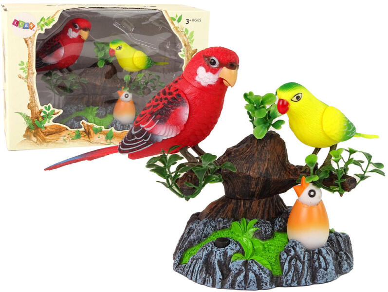 Éneklő mozgó papagájok színes fája Hihetetlenül magával ragadó és interaktív játék, amely elrepíti a gyerekeket a természet varázslatos világába. A valósághű megjelenésnek köszönhetően úgy tűnik, mintha ezek a gyönyörű madarak az otthonunkba költöztek volna. A készletben két papagájt - egy pirosat és egy sárgát - találunk, amelyek egy faágon helyezkednek el, alatta pedig egy kagylóban fekvő kis papagájt. A madarak az ágakon különböző hangokat adnak ki és mozognak, így a természetben érezheted magad, a csibe pedig színes fénnyel világít. A játék aktiválásához egyszerűen nyomd meg a fekete gombot. A teljes szerkezetet gondosan, tartós műanyagból készítettük, így hosszú ideig tartó élvezetet és felejthetetlen szórakozási pillanatokat biztosít. Az eredeti készlet élvezetéhez mindössze három AA elemre van szükséged. A játék méretei (13 cm x 16 cm x 10,5 cm) ideálisak a kis kezek számára, így könnyen kézbe vehető. Kompakt formájának köszönhetően bárhová magaddal viheted! A képzeletet fejleszti, a természet felfedezésére ösztönöz és elképesztő izgalmakat nyújt. A készlet elemei_ - fa - 2 színes papagáj -. kagylófióka - farok piros papagájhoz A játék mérete_ 13 cm x 16 cm x 10,5 cm Pack méretei_ 25 cm x 17 cm x 11 cm CE minősítéssel rendelkezik, Ezenkívül megfelel az EN71 szabványnak. A játék 3 éves kor feletti gyermekek számára alkalmas.