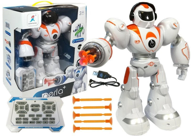 R/C távirányítású robot lő rakétákkal . A távirányítós robot egy csodálatos játék, amely biztosan nagyszerű szórakozást nyújt bármelyik gyermeknek, több órányi kreatív játékot biztosítva. A robotot távirányítóval irányítják, melynek köszönhetően minden irányba mozog, előre, hátra, jobbra, balra fordul, csúszik, énekel, robotnyelven beszél és táncolni is tud. Többfokozatú hangerőszabályzóval és DEMO programmal rendelkezik, így megnézheted a képességeit. A robot által végzett minden mozdulathoz hanghatás is társul. . A robot nem igényel elemeket, beépített újratölthető akkumulátorral rendelkezik, amelyet a mellékelt USB-kábel segítségével tölthet fel pl. számítógépén keresztül. Az újratölthető akkumulátor jelentősen csökkenti az üzemeltetési költségeket, és azt is lehetővé teszi, hogy hosszabb ideig élvezze játékát. A robot hátulján található egy ki/be kapcsoló gomb, amellyel ki- és bekapcsolhatod a robotot, míg a törzsön elöl található egy gomb, amellyel el tudod altatni a robotot. Amikor a játék be van kapcsolva, a robot szemei és kezei LED technológiával világítanak. A robot remek lehetőség a szeretteinkkel való közös játékra. Az ilyen játékoknak köszönhetően a gyerekek, több időt tölthetnek szüleikkel. A készletet egy mutatós dobozba csomagolták, tökéletes ajándék a technikai újdonságok minden rajongójának... Elemek beállítása_ -. távirányítható robot-távvezérlés- 5 golyó narancssárga színben- USB töltő A készletelemek méretei_ - távvezérelhető robot : 40,5 cm x 34 cm x 16 cm - távvezérelhető távirányító : 14,5 cm x 8,5 cm x 3 cm - rakéta narancssárga színben : 6,5 cm Pakett méretei_ 40,5 cm x 34 cm x 15,5 cm A távirányítóhoz két 1,5 V-os "AA" elem szükséges. A robotot 3 év feletti gyermekek számára tervezték. A játék CE tanúsítvánnyal rendelkezik, és megfelel az EN 71 szabványnak . Átlátszó vitrinben lévő kartondobozba csomagolva, így ideális ajándékozásra. .