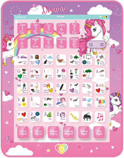 Lexibook Unicorn Kétnyelvű Oktató Tablet: Tanulás Játékosan! ? Ez a vidám, unikornisos Lexibook tabletta 3 éves kortól szórakoztató és hatékony módon segíti a gyermekek angol és magyar nyelvtudásának fejlesztését. A könnyen kezelhető érintőképernyővel és a színes grafikákkal a tanulás igazi élménnyé válik! Mit kínál a Lexibook Unicorn tabletta?Kétnyelvű oktatás: Magyar és angol nyelven is használható, könnyedén válthatsz a nyelvek között. Interaktív kvízek: Szórakoztató kvízek segítenek a gyors gondolkodásban és a szókincs bővítésében. ⏱️ Kb. 7 másodperced van a helyes válasz kiválasztására! Betűk és szavak felfedezése: A gombok lenyomásával a tabletta kimondja a betűket, számokat és szavakat, segítve az írás-olvasás tanulásában. Szótagolás: A szótagolás funkció fejleszti a helyesírási készségeket. Zenés tanulás: Vidám dallamok teszik élvezetessé a tanulást. ? Könnyű kezelhetőség: A hangerő szabályozása és a nyelvváltás gyerekjáték. A csomag tartalma: Lexibook Unicorn kétnyelvű oktató tablet 3 db AAA/LR03 1.5V elem (tartozék) Használati útmutató A Lexibook Unicorn oktató tabletta tökéletes választás a szórakoztató és hatékony nyelvtanuláshoz!