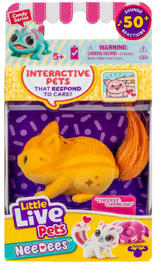 - Több mint 50 hang és reakció- Interaktív, hordható kisállatok- Gondoskodást igényelnek (fázás, éhség, álom)- Pontgyűjtés: énekelnek a legmagasabb pontszámnál- Könnyen rögzíthetők ruházathoz- 13 különböző NeeDee a 2. szériában (pl. Chippee, Pinkee, Scampee, Ouchee, Woofee, Splashee, Oinkee, Plumee, Curlee, Sandee, limitált Arany Mókus)- Csomag tartalma: 3 db LR44 elem, 1 db interaktív NeeDee, 1 db használati útmutató, 1 db gyorsindítási útmutató- Csomagolás mérete: 10 x 5.2 x 17.4 cm