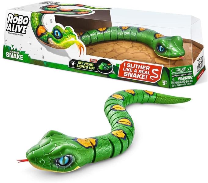 [Tudtad, hogy a kígyók testalkotása igen sajátos, szinte semmilyen más állatcsoporttal össze nem téveszthetők? Majdnem 2400 kígyófaj létezik. Színük, mintájuk és zsákmányszerző taktikájuk változatos. Mindent megesznek, termetes zsákmányát is le tudja nyelni. Fedezd fel a kígyók életét az élethű Robo Alive - Kígyó robot állattal, aki pont úgy mozog és viselkedik, mint az igazi! A kígyó sziszeg és nyújtogatja a nyelvét. Sötétben világít a szája. Kapcsold be, tedd le a földre és figyeld, hogy cikázik össze-vissza! Csak érj hozzá, és máris abbahagyja a mozgást. Működéséhez 2 db AA típusú elem szükséges, amelyeket a csomagolás nem tartalmaz!
